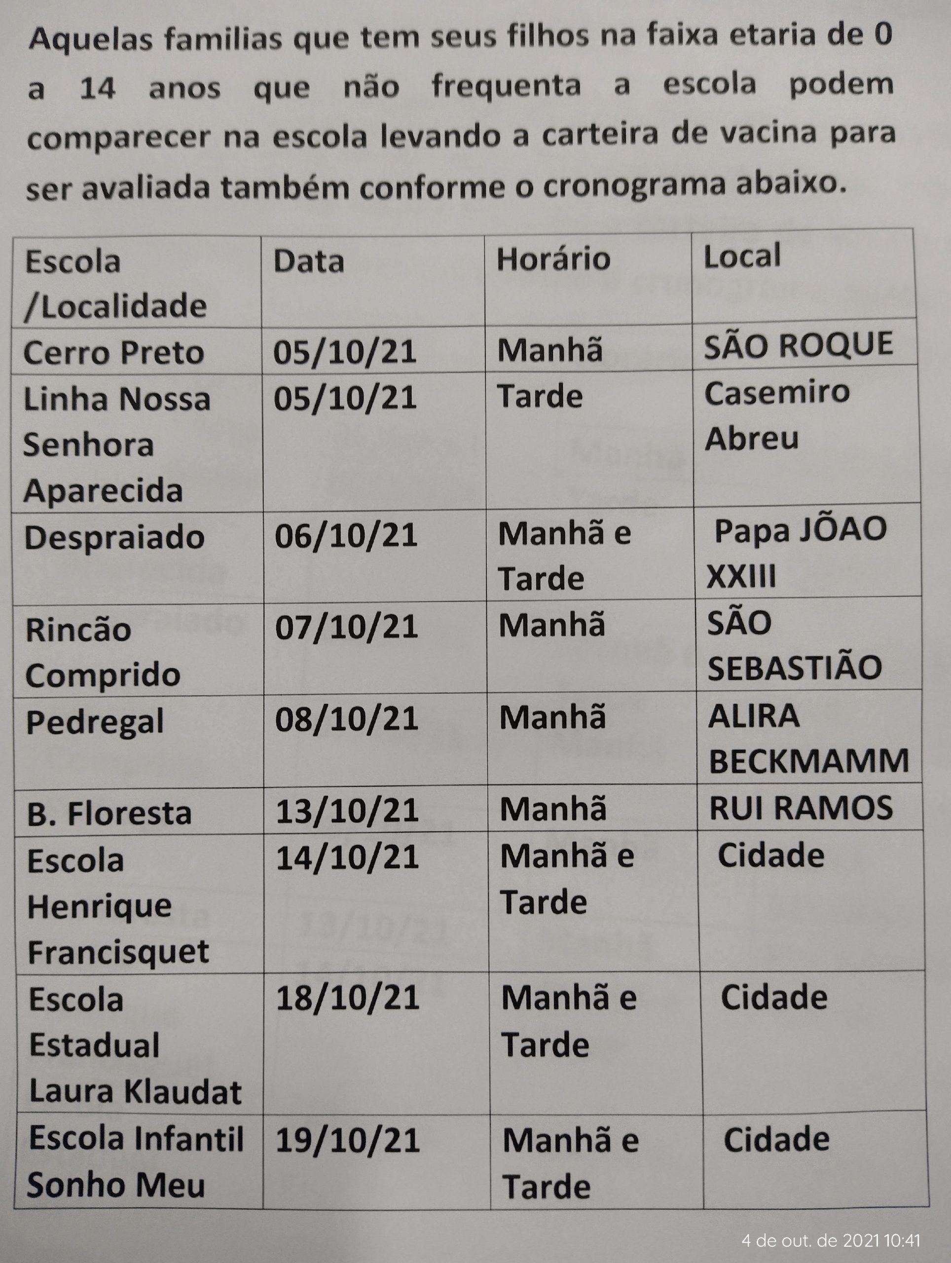 <div class="" dir="auto"> <div id="jsc_c_26" class="ecm0bbzt hv4rvrfc ihqw7lf3 dati1w0a" data-ad-comet-preview="message" data-ad-preview="message"> <div class="j83agx80 cbu4d94t ew0dbk1b irj2b8pg"> <div class="qzhwtbm6 knvmm38d"> <div class="kvgmc6g5 cxmmr5t8 oygrvhab hcukyx3x c1et5uql ii04i59q"> <div dir="auto">Vacina será realizada nas escolas municipais por localidade e escola estadual.</div> <div dir="auto">Estudantes devem levar sua carteira de vacina para ser avaliada.</div> </div> </div> </div> </div> </div>